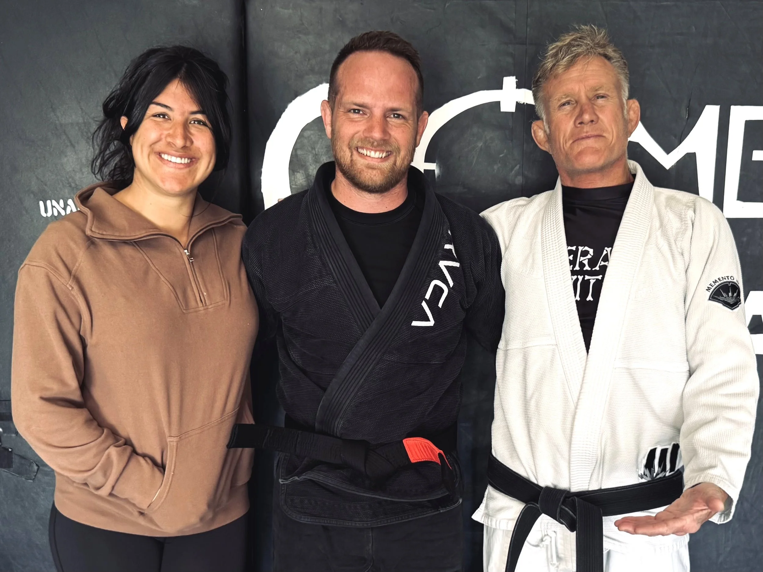 Three people standing side by side in a martial arts gym, two men wearing Brazilian Jiu-Jitsu gis, one woman in casual attire, smiling at the camera.